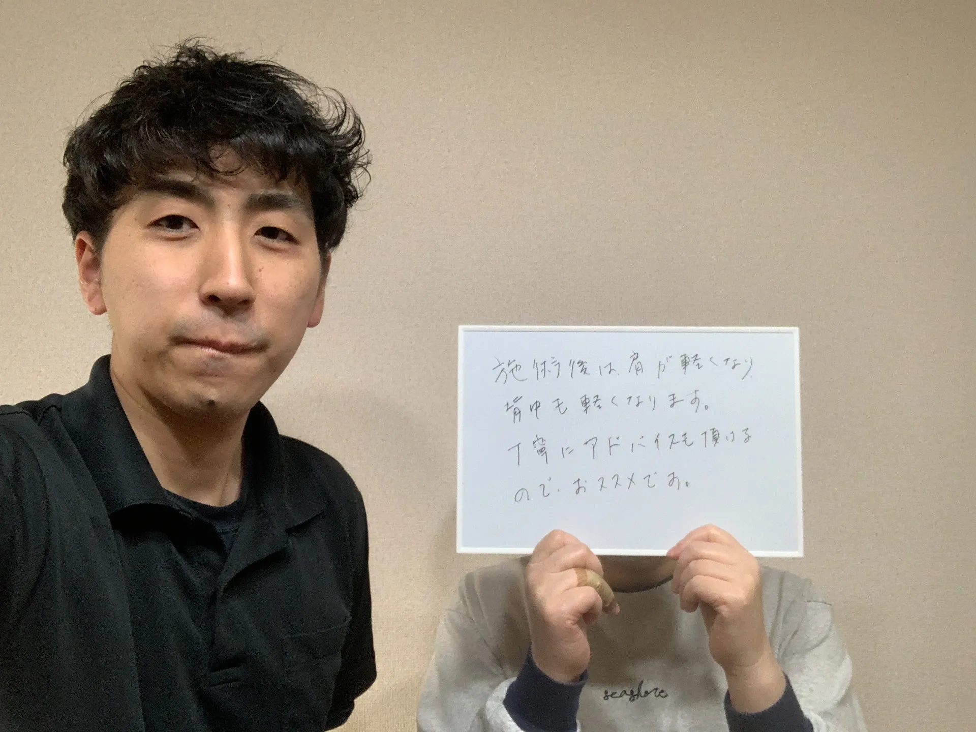 はじめに悩みや症状を丁寧に聞き取ってもらえたので、不安な気持ちも和らぎました。 施術を受けた後、肩まわりが軽くなり、腰の痛みも和らいだ実感がありました。